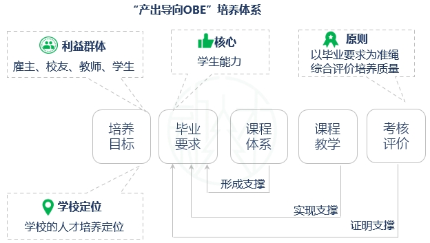 基于产出(成果)导向的教育。首先要根据社会需求及学校定位明确人才培养目标(产出);其次要构想和定义为达到培养目标,学生在毕业时应达到的学习水平(成果)——毕业要求;进而设计能够支撑毕业要求达成的课程体系、配备师资队伍、完善教学支持条件;最后是教学实施、对教学成果(产出)进行评价,并根据评价结果对OBE体系中各环节进行持续改进。